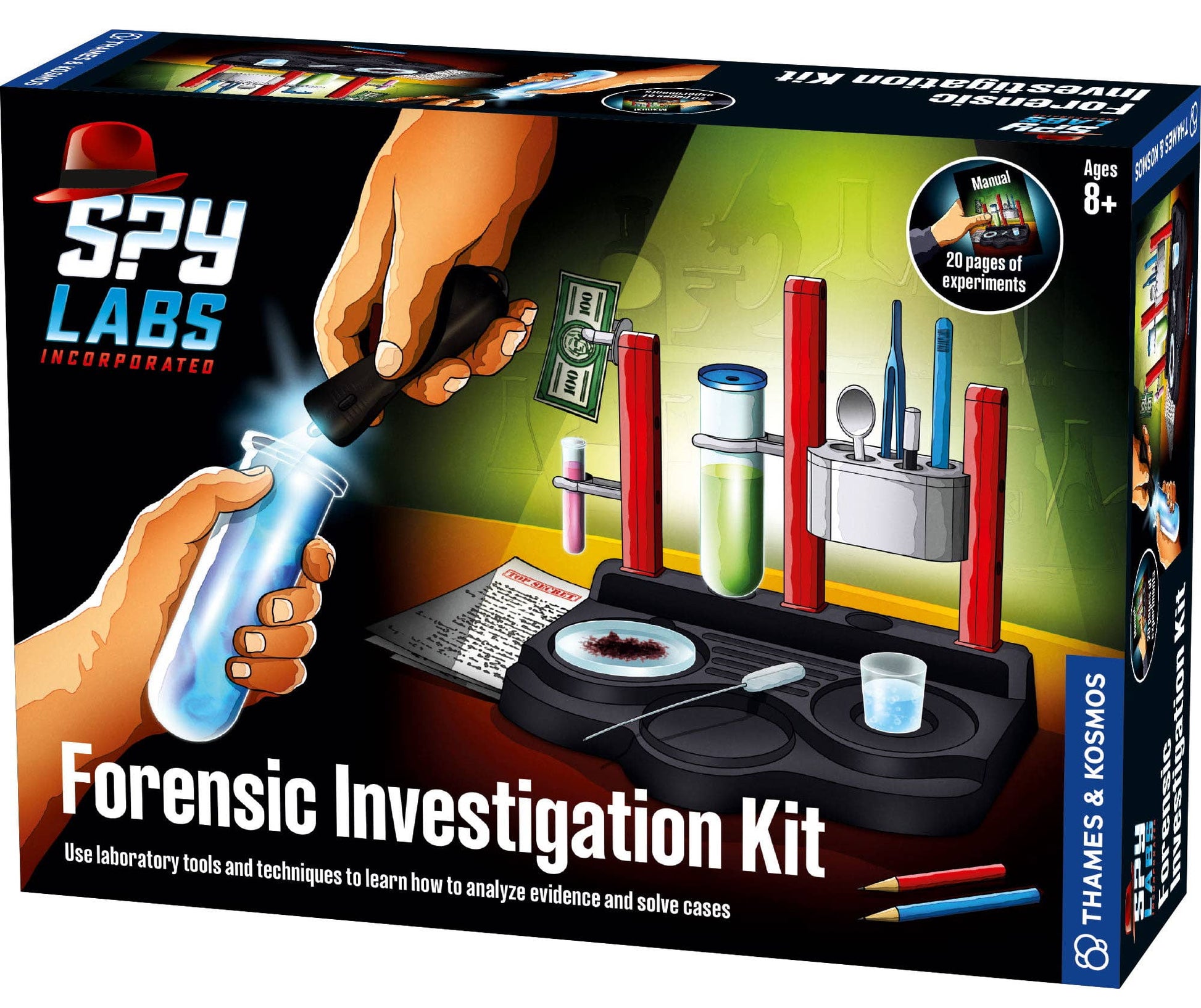 Using the Forensic Investigation kit assume the role of a forensic scientist to find out! Perform experiments on evidence in this large laboratory station using chemical and physical techniques. Analyse solids and liquids, make a fluorescent solution, inspect invisible ink, lift fingerprints, look for counterfeit notes, and examine ink using chromatography. The experiments are accompanied by exciting stories of make-believe mysteries and crimes to solve.