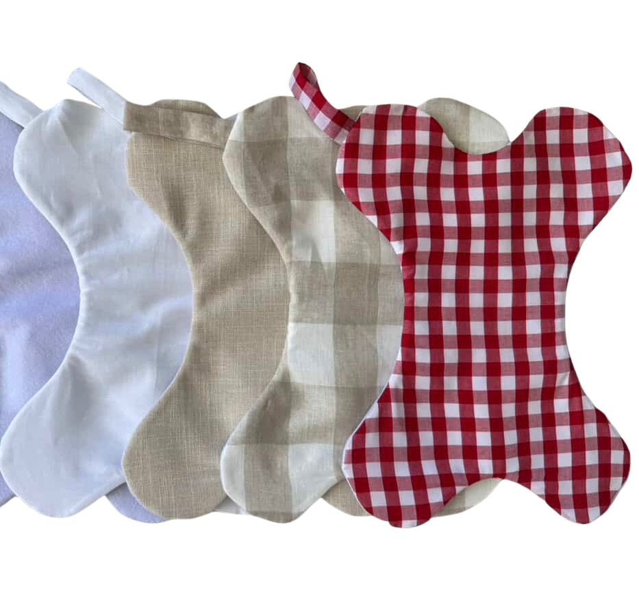 Stockings are available in the same 4 styles as our personalised Christmas Stockings: Gingham | White Linen | Red check | Red & Green Tartan | Beige